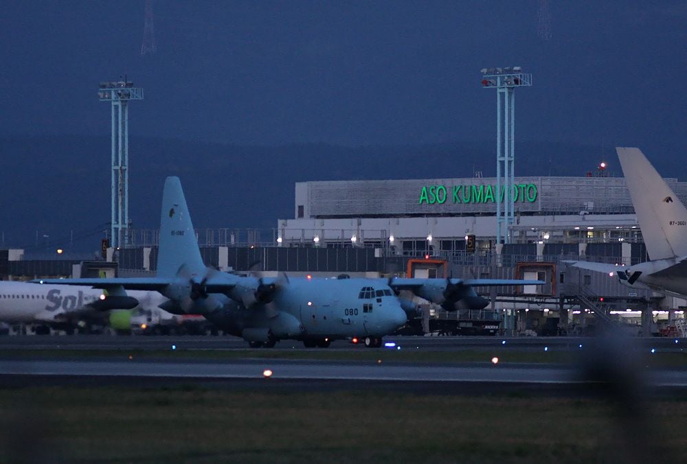 2016年4月14日と16日に起こった熊本地震で被災した市町村支援 のために、熊本空港に隣接する高遊原基地を拠点に、 米軍をはじめ自衛隊機が頻繁に物資輸送を行いました。 支援活動中にも震度5強の余震がたびたびありました。 米軍のオスプレイは、八代海に展開している海上自衛隊の ヘリコプター搭載護衛艦「ひゅうが」から離発着して救援活動を 行っていたそうです。