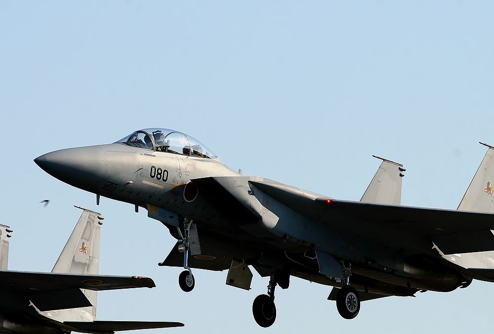 2011年11月の新田原基地です。 このころは、本滑走路の工事中で仮滑走路を使用していました。 南側フェンスからとっても近い距離で離陸を撮ることができました。 F15がパイロンもタンクも付けないクリーンな状態で飛行していました。 RW10からの23SQ-F15の離陸です。