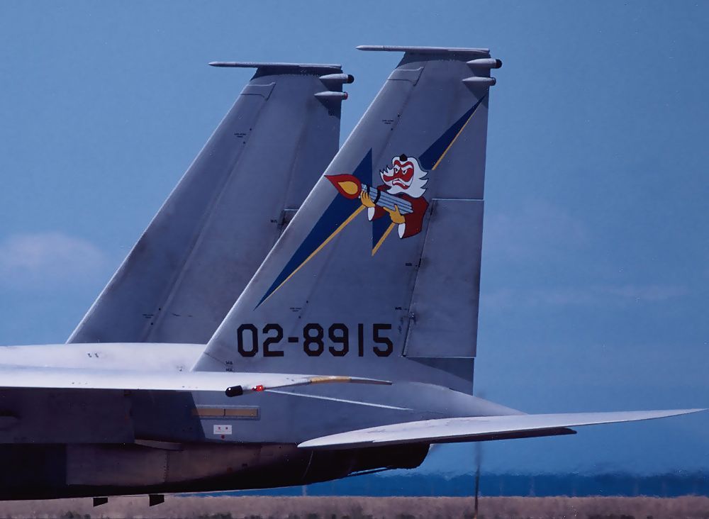 1995年の築城基地304SQ-F15の戦技競技会用塗装はとっても ユニークでした。 部隊マークの天狗様がガトリング砲を抱えていました。 (1995年5月12日、築城基地にて撮影)