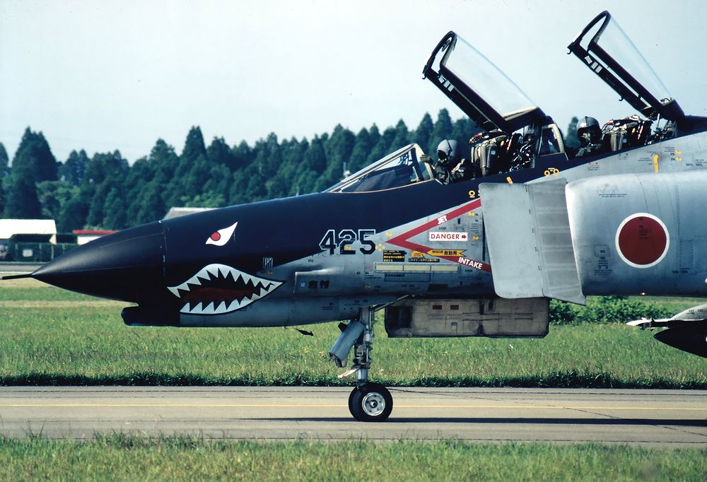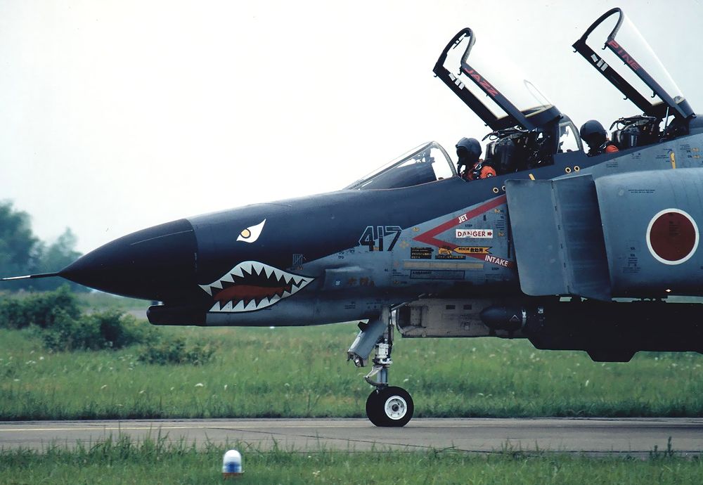 1995年5月-6月に、新田原基地のRW28エンドで見た 301SQ-F4の戦競塗装機です。 機体に5空団を示す大きなVマークを描いていました。 マニアには大喜びの年でした(^^)。 隊長機の417号機は眼が金色、胴体のVマークに金色の筋が入っていました。 F4機体の正式塗装の変更時期で新旧塗装機がいました。