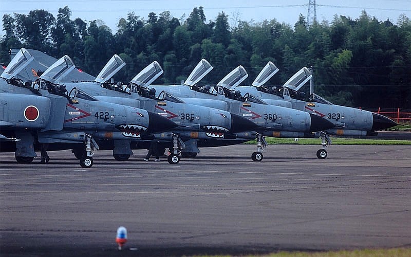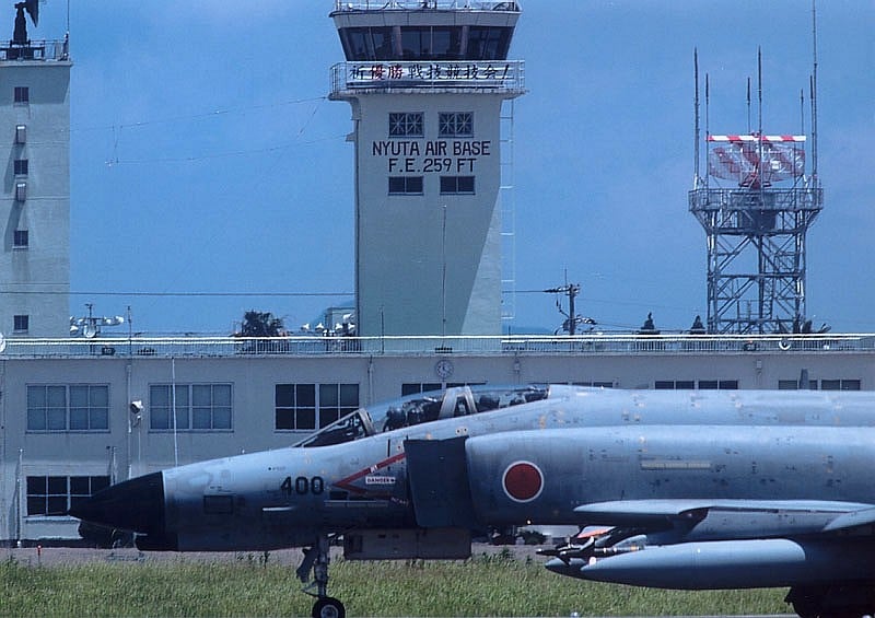 2003年7月の戦技競技会前の新田原基地です。 タワーに「祈 優勝 戦技競技会」の旗が掲げてあります。 シャークF4 2機とノーマルF4 2機が訓練しました。 It is the Nyautabaru base before the tactical competition in July 2003. The flag of "Prayer championship tactics competition" is raised on the tower. Two Shark F4s and two Normal F4s were trained.