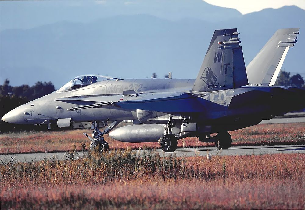 これは1997年11月09日に築城基地航空祭終了後に岩国基地に帰る米海兵隊のFA18です。 This is the US Marine Corps FA18 returning to Iwakuni Base after the Tsuiki Air Base Festival on November 09, 1997.