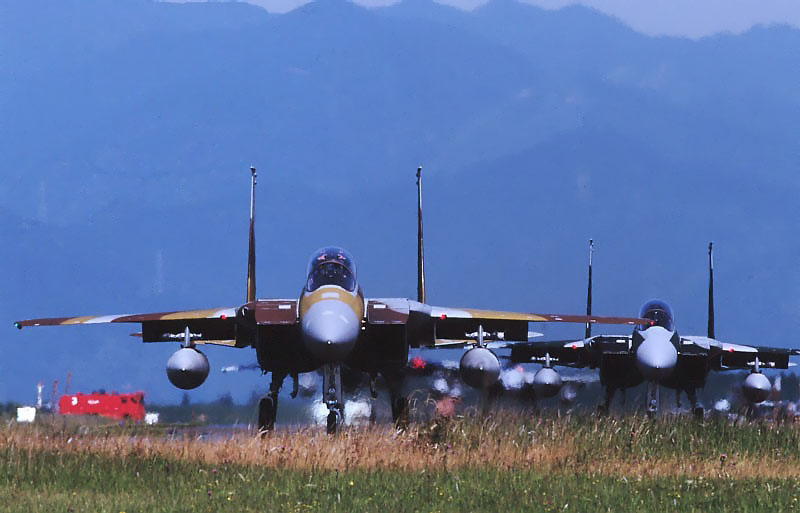 各戦闘機部隊の機体と対戦するAGRのF15のRW28のタキシ―です。