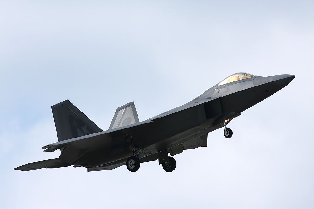 2016年2月上旬の嘉手納基地です。 AKのF22が嘉手納基地に展開していました。 AK 525FS号機機の降りです。 It is Kadena Air Base in early February 2016. AK F22 was deployed at Kadena Air Base. AK 525FS is getting off.