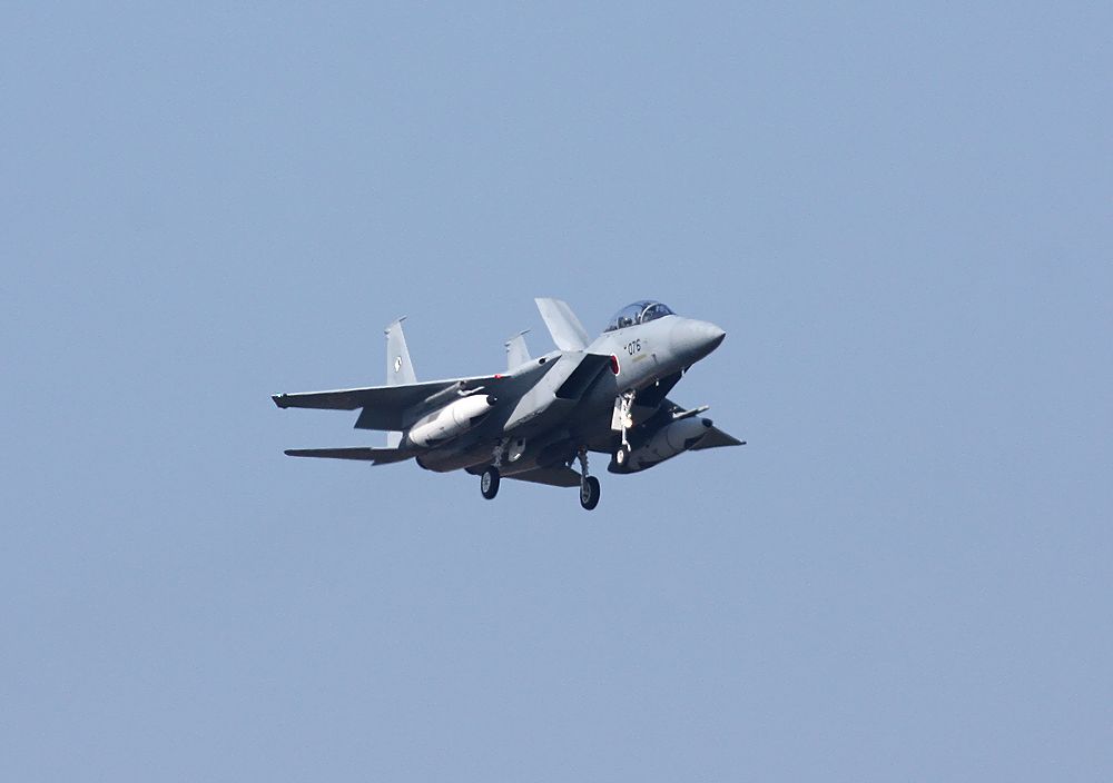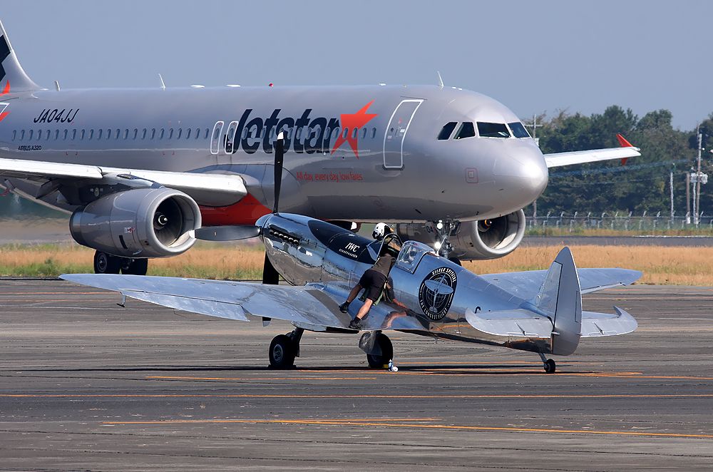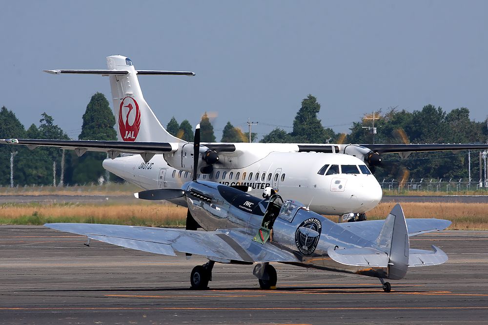 これは駐機している「シルバースピットファイア」の後ろをタキシ―する日本の旅客機です。
