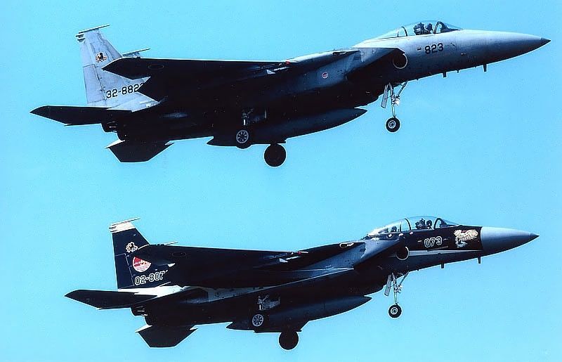2004年6月末に新田原基地で撮影した航空自衛隊50周年記念塗装の23SQーF15DJの編隊フライパスです。