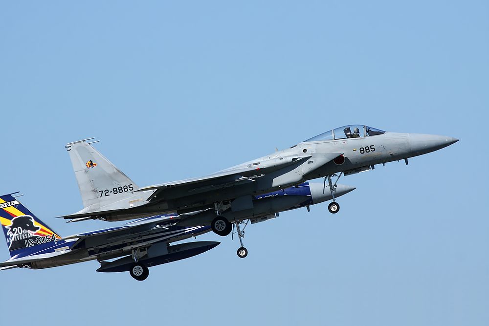 の午後に新田原基地で撮影した23SQの創隊20周年記念塗装F15DJの編隊離陸です。