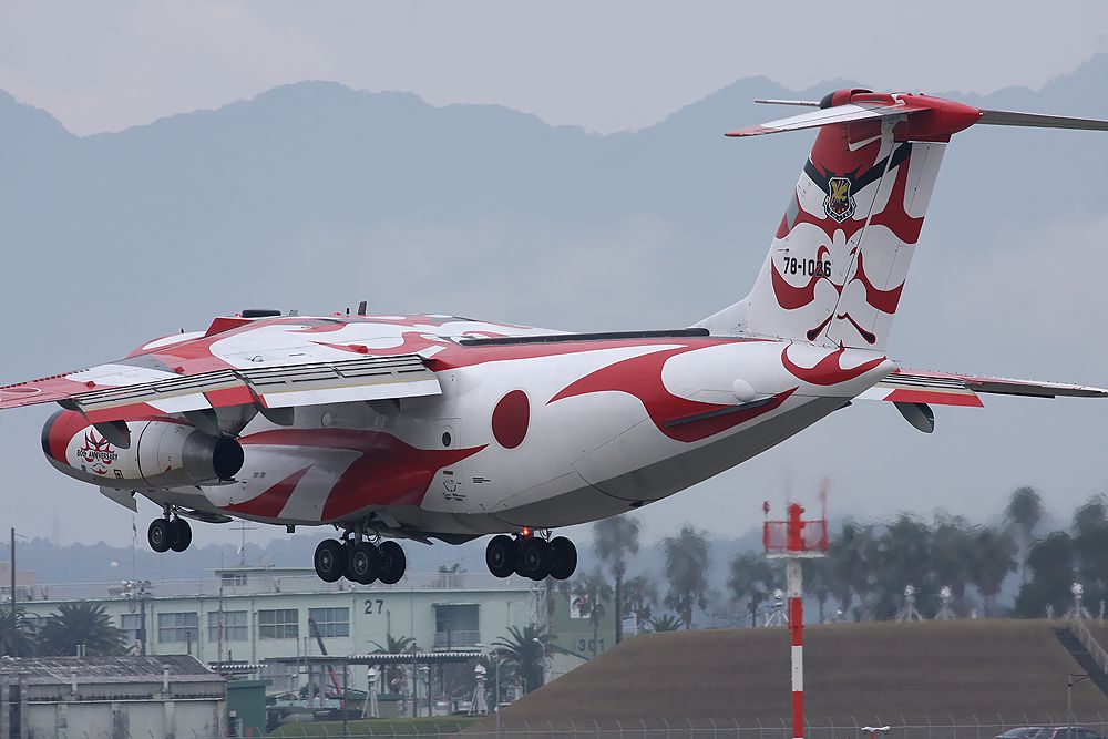 これは2018年11月13日(火)に新田原基地に通常任務で飛来した入間基地の第2輸送航空隊60周年を記念した「歌舞伎」塗装のC-1輸送機です。