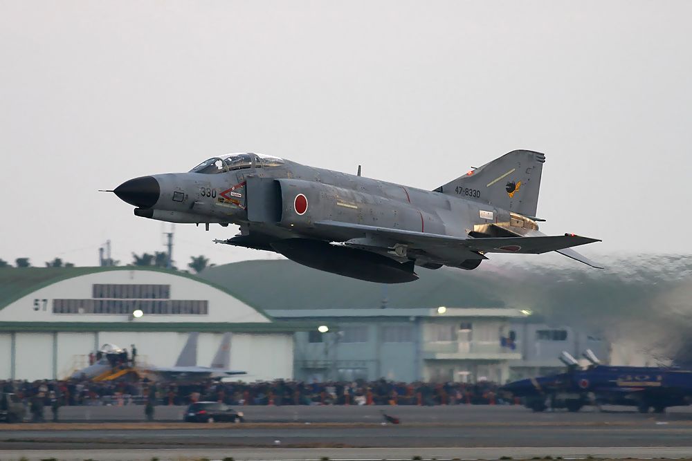これは301飛行隊創設40周年記念塗装のF4のデモフライト(編隊離陸)です。