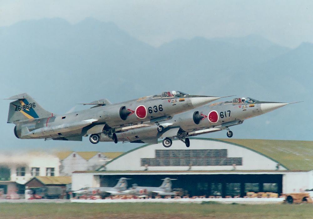 これは、私が初めて1眼レフカメラを買って、1983年7月-9月に新田原基地で撮影した204SQのF104Jの編隊離陸です。