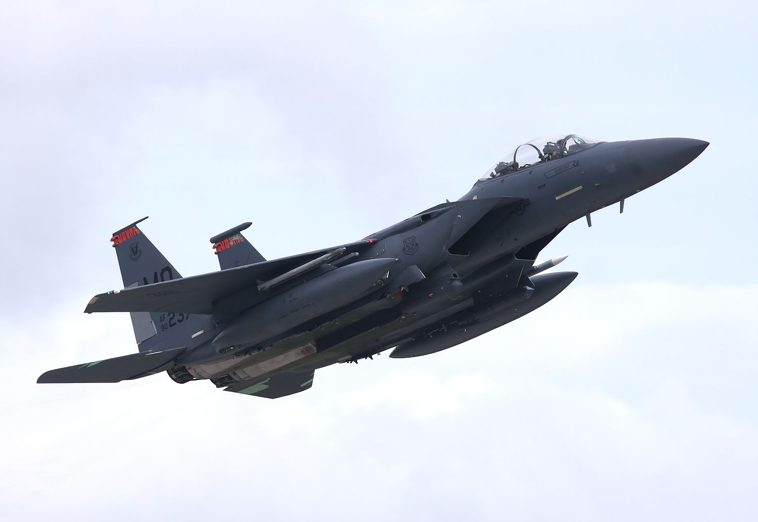 これは、2023年7月13日(木)に、築城基地の堤防ポイントにて撮影した、マウンテンホーム空軍基地(MO)に所属するF-15Eの離陸です。