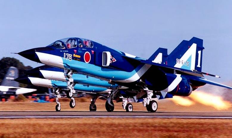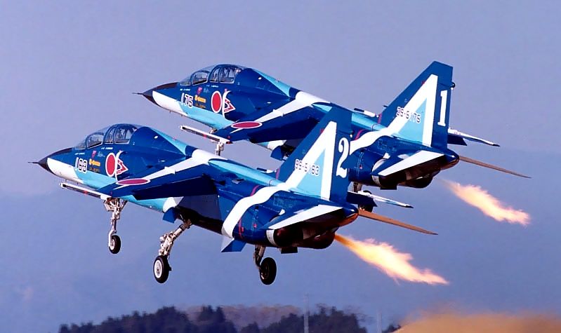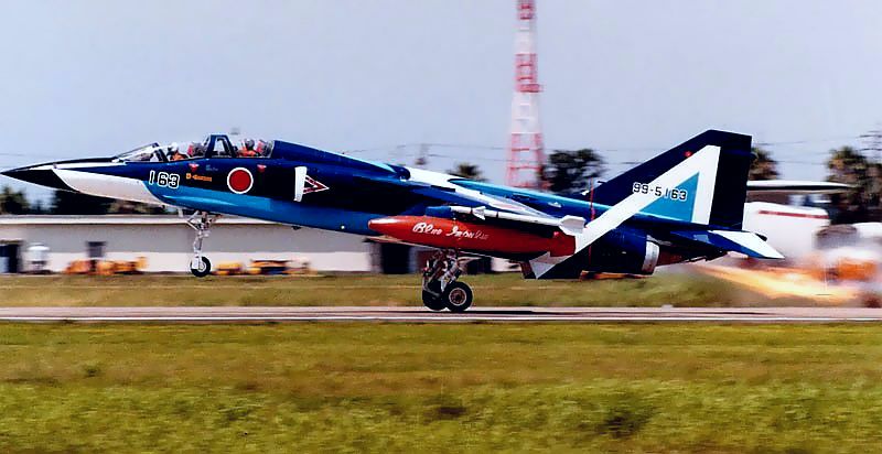 これは、1992年11月の新田原基地航空祭で演技飛行のために編隊離陸した松島基地の所属の「T2ブルーインパルス」です。