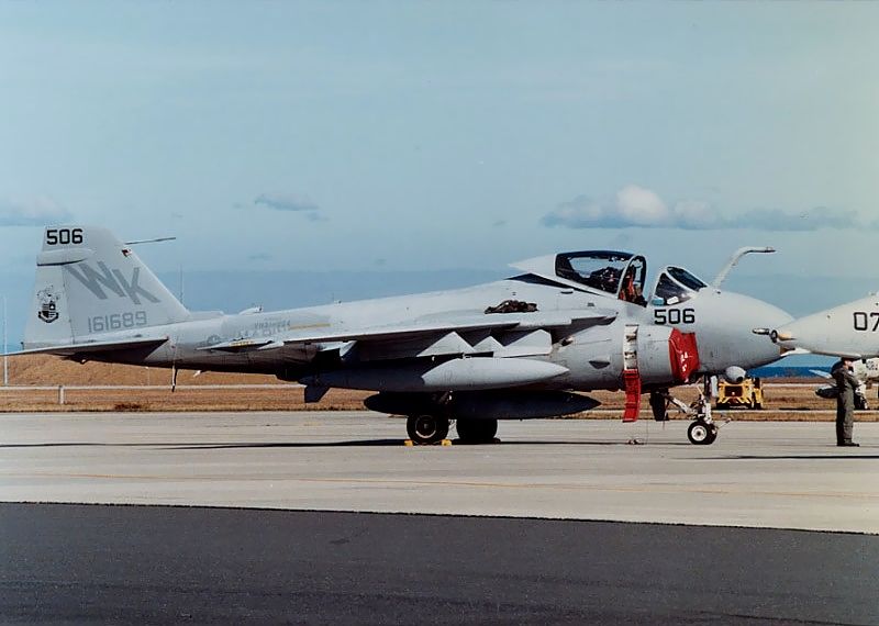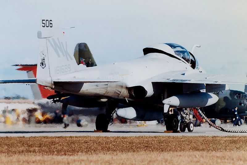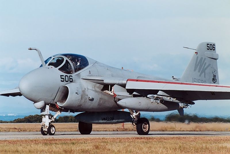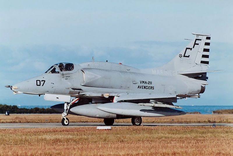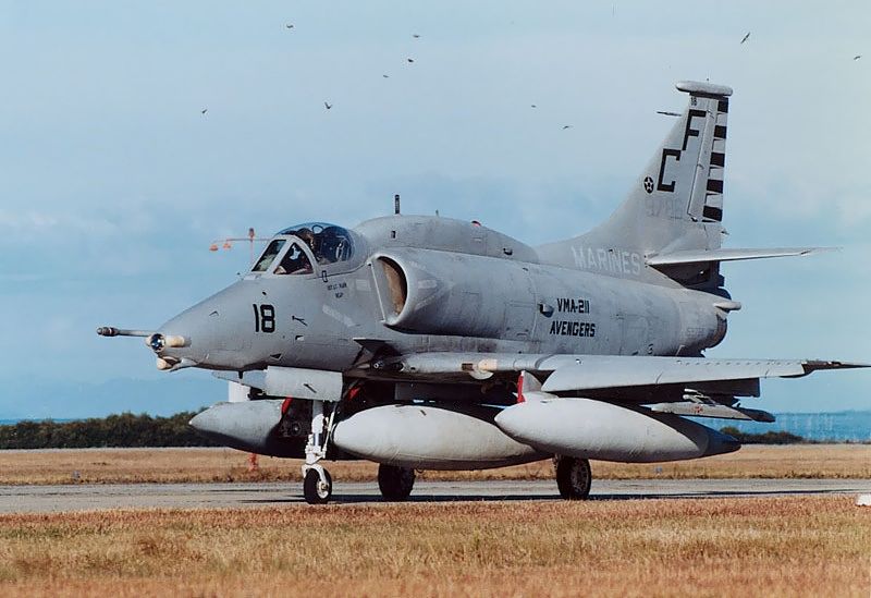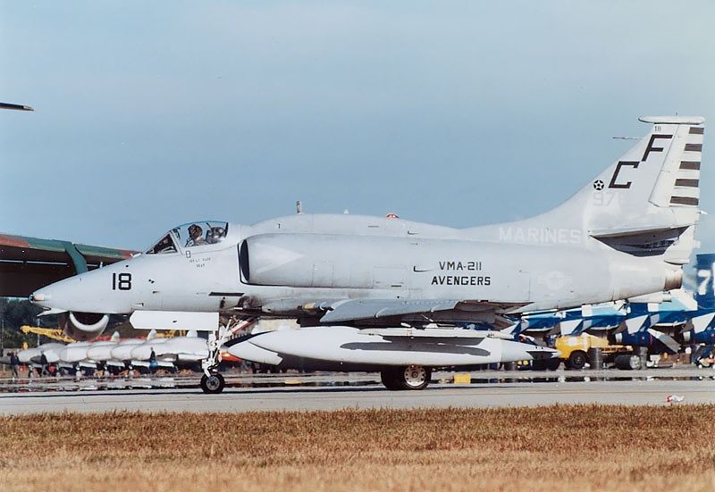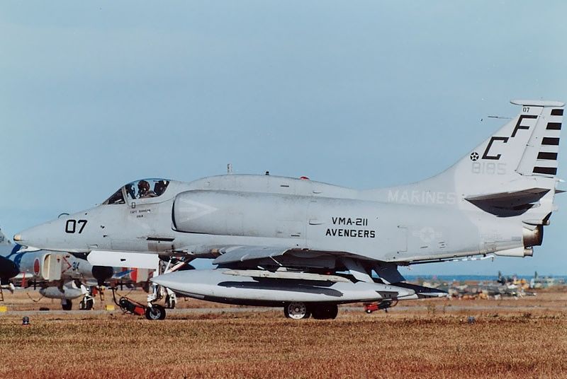 これは、航空祭終了後に岩国基地にもどるためにRWにタキシーする米海兵隊VMA211のA4E アベンジャーズとその隊員さんです。 |