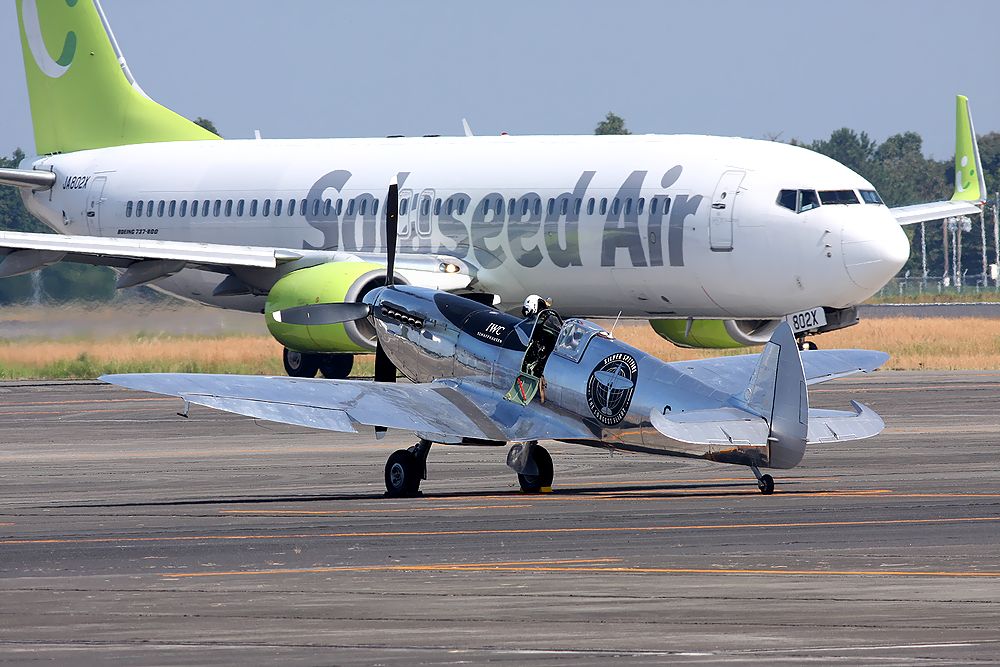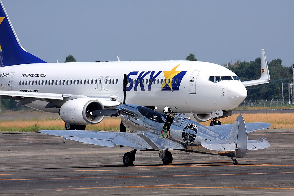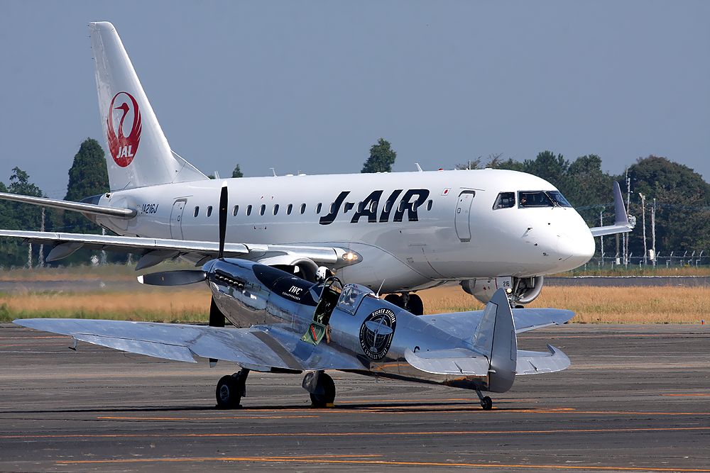 これは駐機している世界の名機「シルバースピットファイア」の後ろをタキシ―する日本の旅客機です。