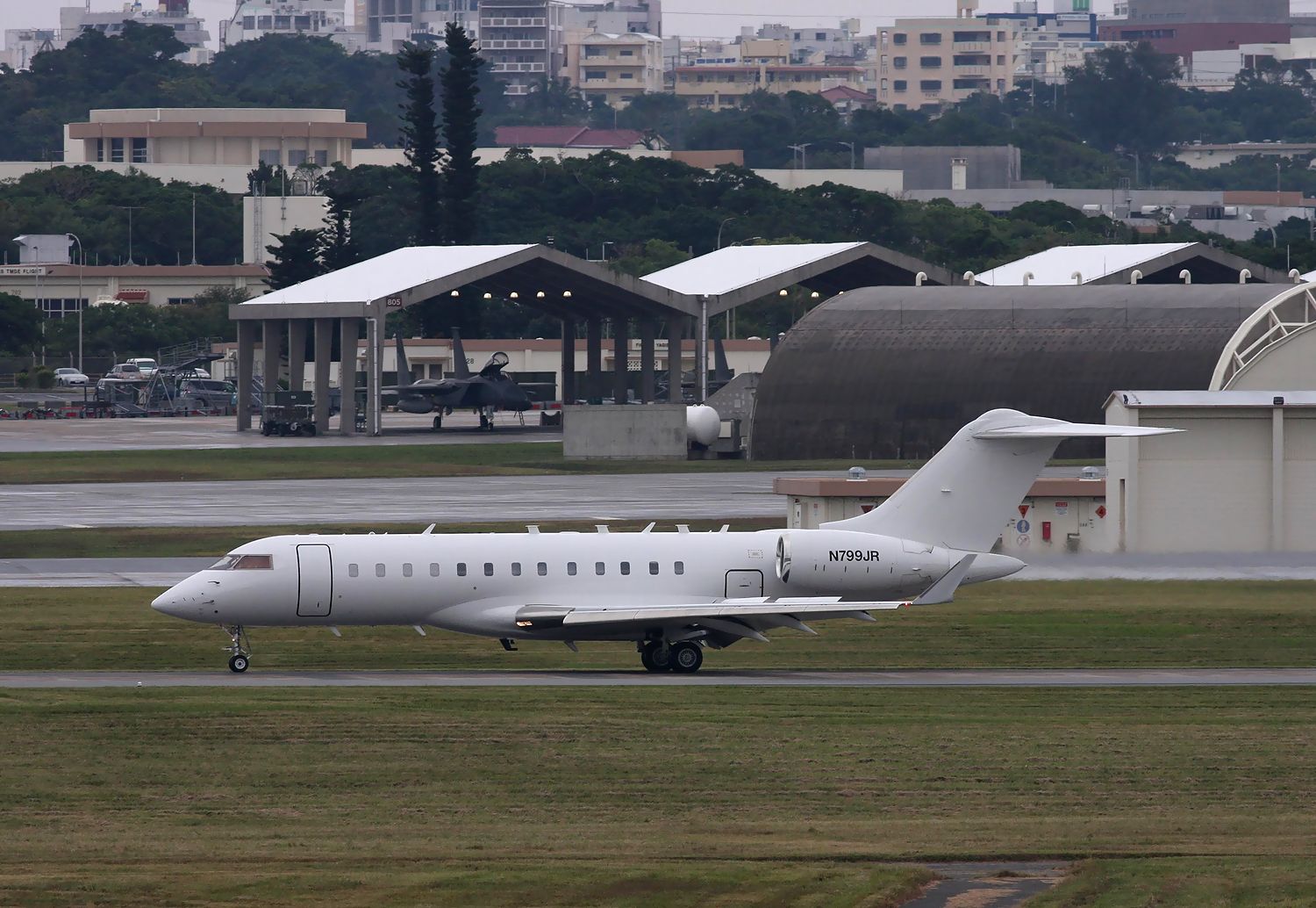 小雨の中、着陸後にタキシーウエイを進んできました。