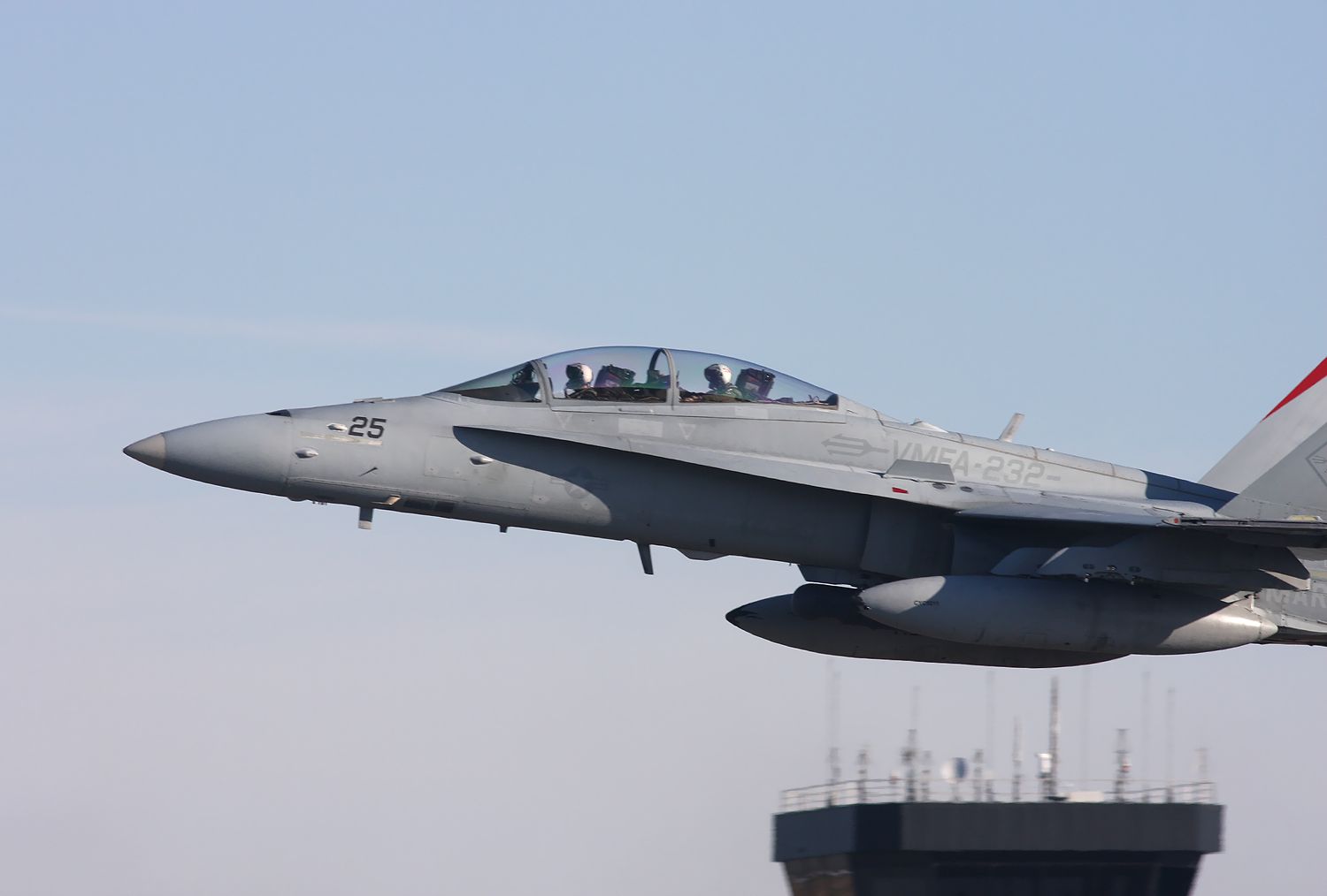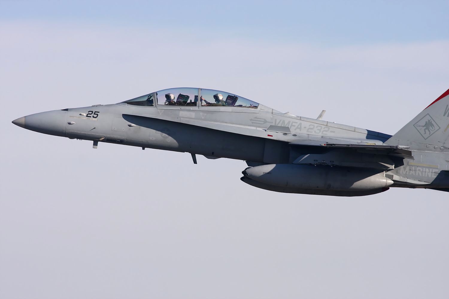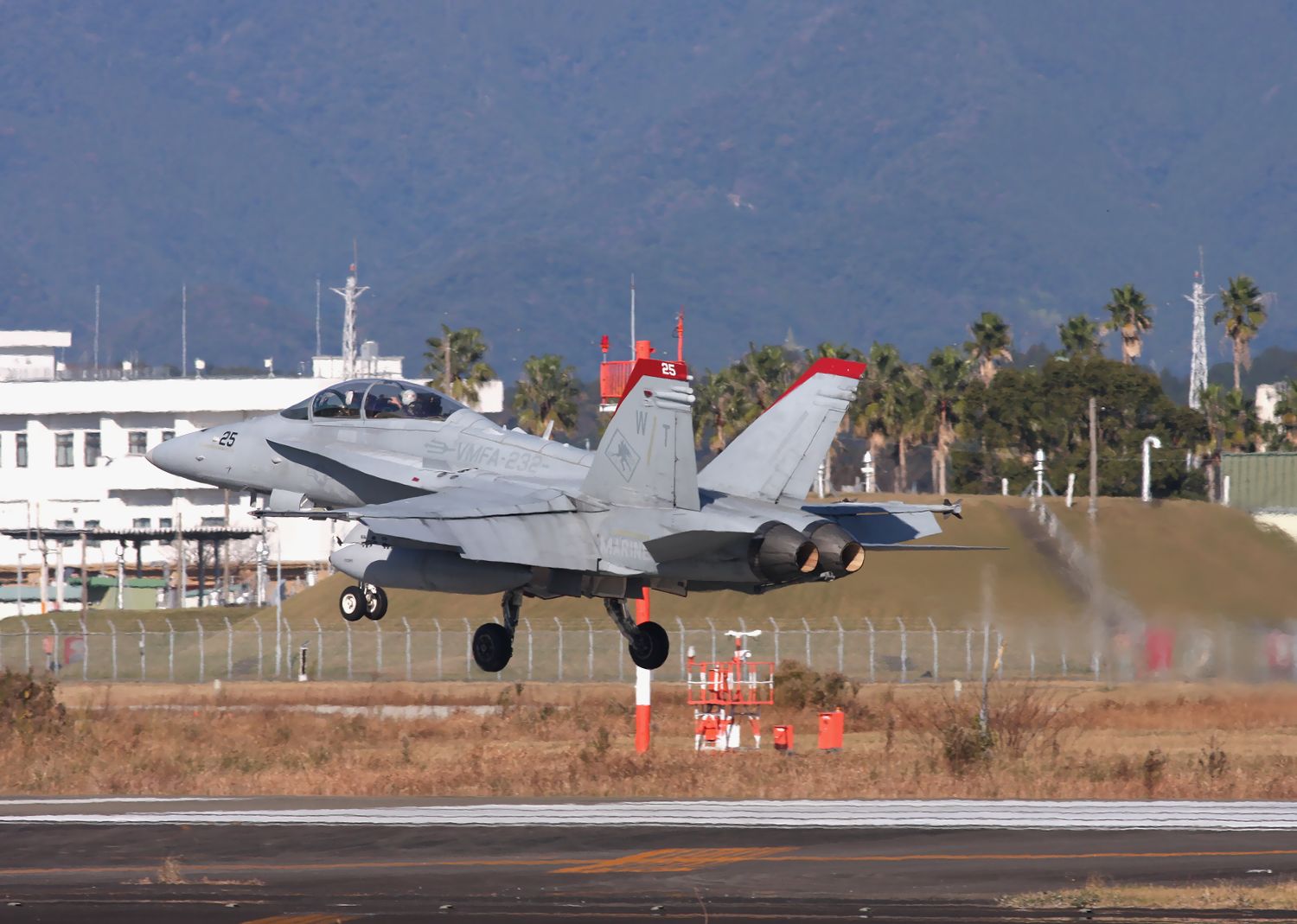 2023年12月18日(月)に新田原基地で撮影したVMFA232-FA18C/DのRW28からのオーバーヘッドアプローチです。