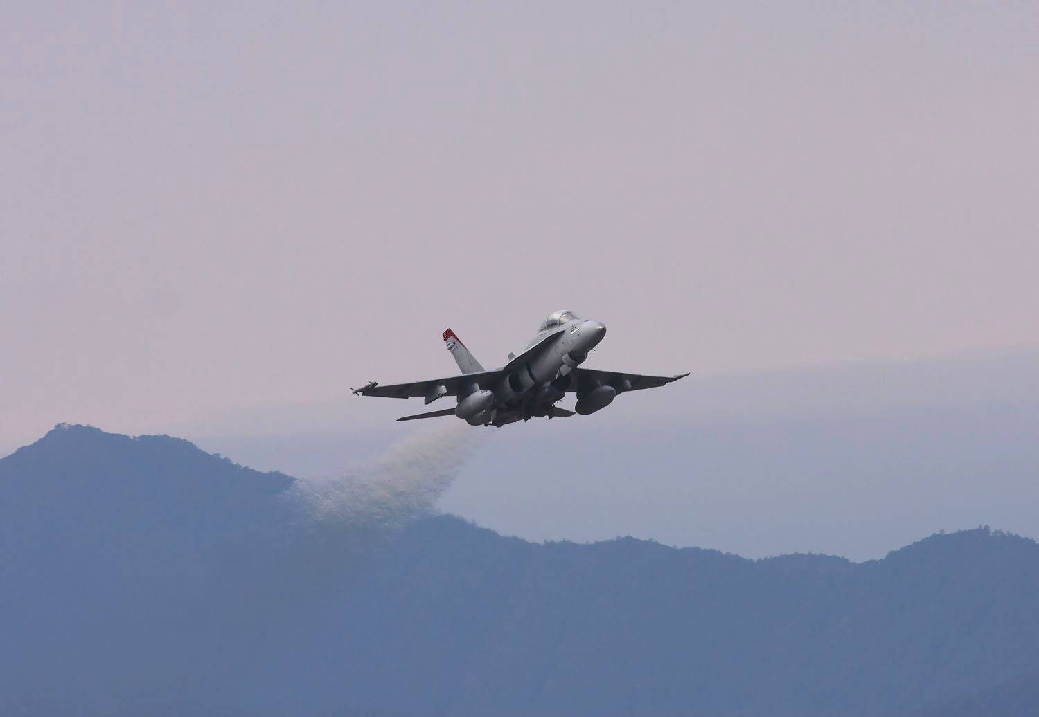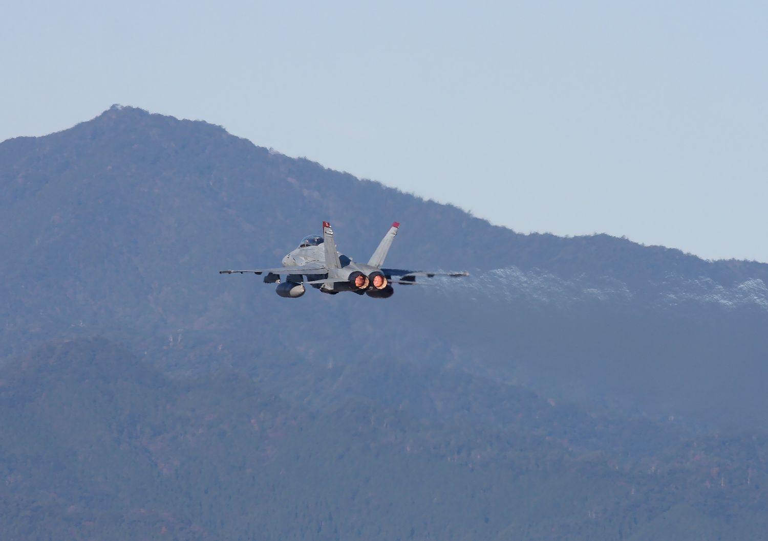 とても低いアフターバーナー離陸で、背景の山々と重なりました。 |