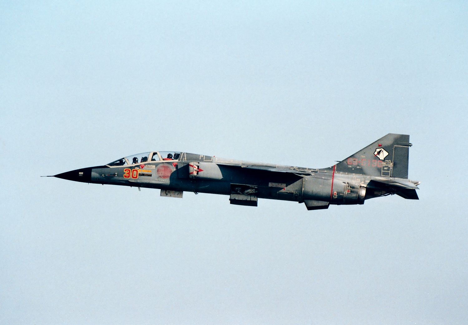 これは、1984年1月22日に開催された新田原基地航空祭でデモフライトを行ったAGR-T2です。T2は、通常のガルグレー正式塗装の上から、外観が当時の仮想敵国のMIG21に見えるように、T2機体の垂直尾翼や翼端に黒色(127号機と134号機)や黄色(130号機)のシルエットを描いていました。またソ連軍機風に2桁の赤い機番を描き、胴体真下にはフォルスキャノピーを描いていました。