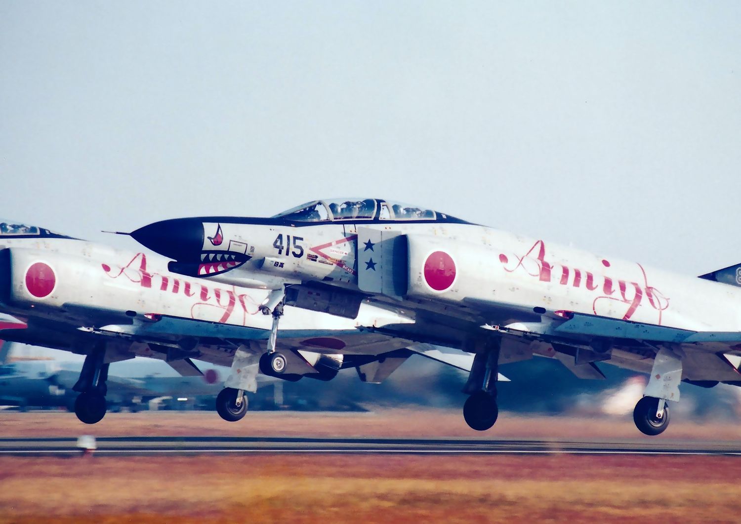 早朝の異機種編隊飛行のために、2機のAmigo塗装のF4EJが編隊離陸しました。 |
