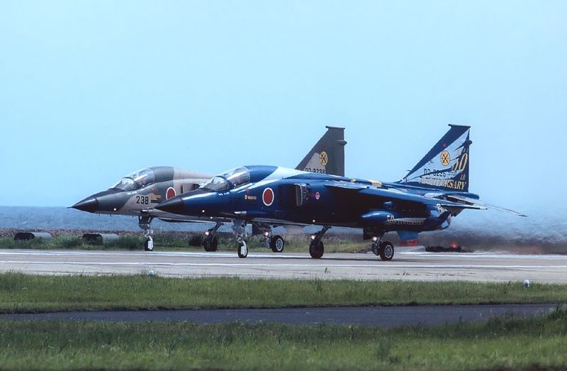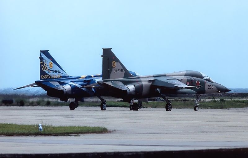 これは1994年08年24日に、築城基地のRW07エンドで撮影した、離陸を待つ6SQのT2練習機とF1戦闘機です。