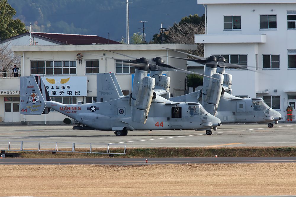 これは、2017年12月13日(水)に、「阿蘇くまもと空港」に隣接する陸上自衛隊高遊原駐屯地に飛来した VMM-262 フライングタイガース のMV-22オスプレイの離陸です。