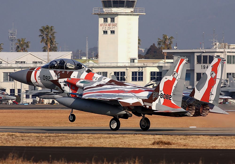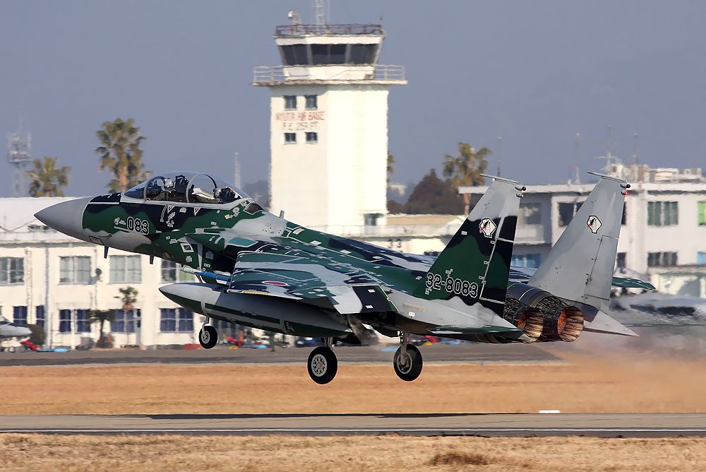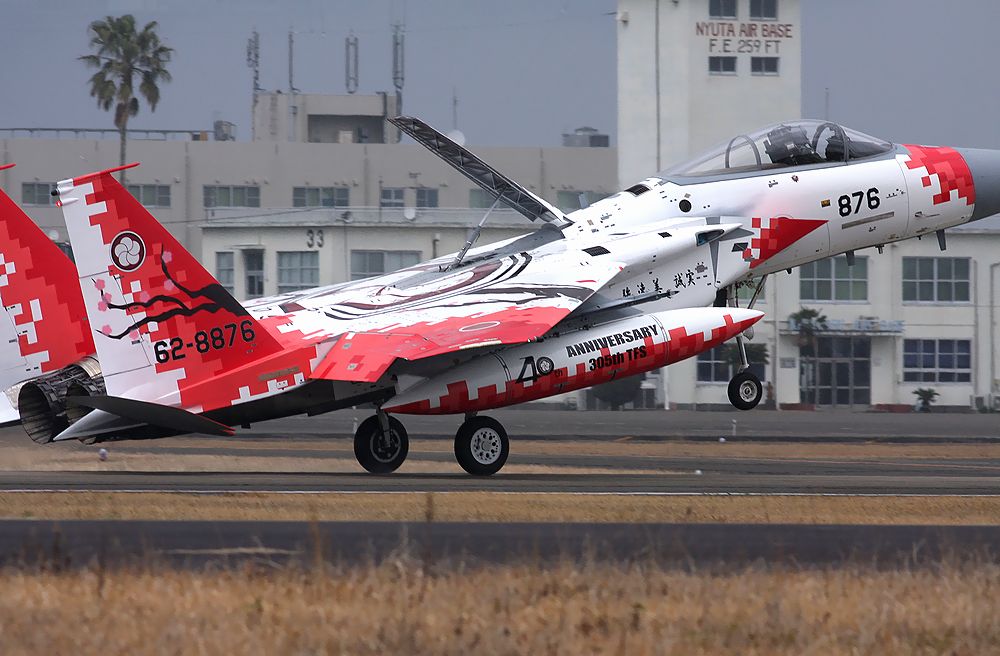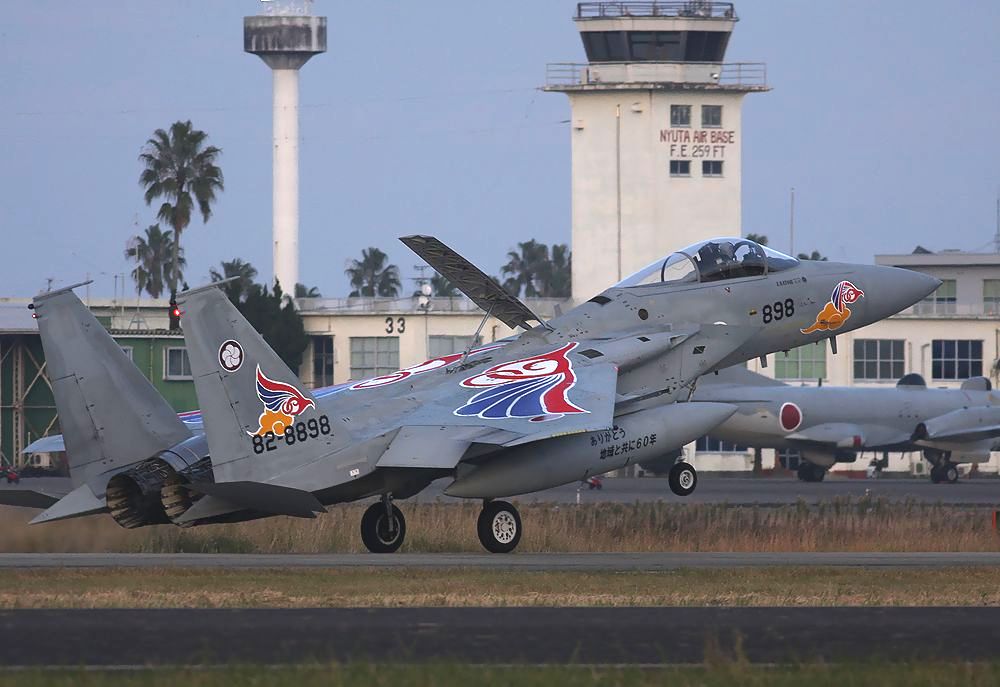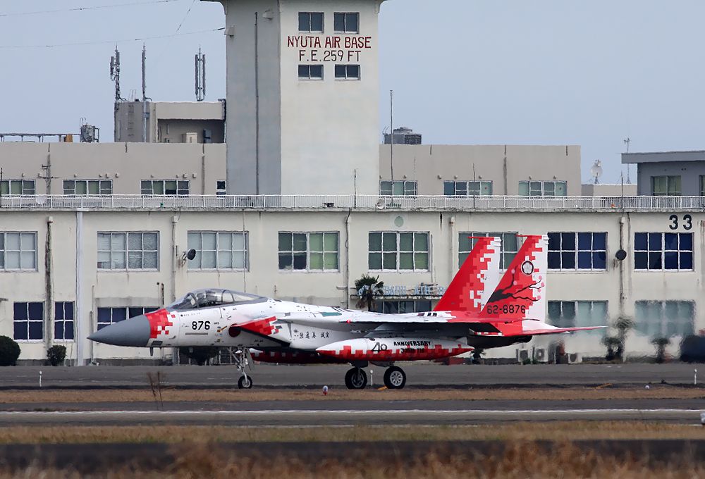 | これは2020年3月に新田原基地で撮影した、背景に「ニュータ・タワー」が写り込んだ小松基地所属の306SQ-F15Jです。 |