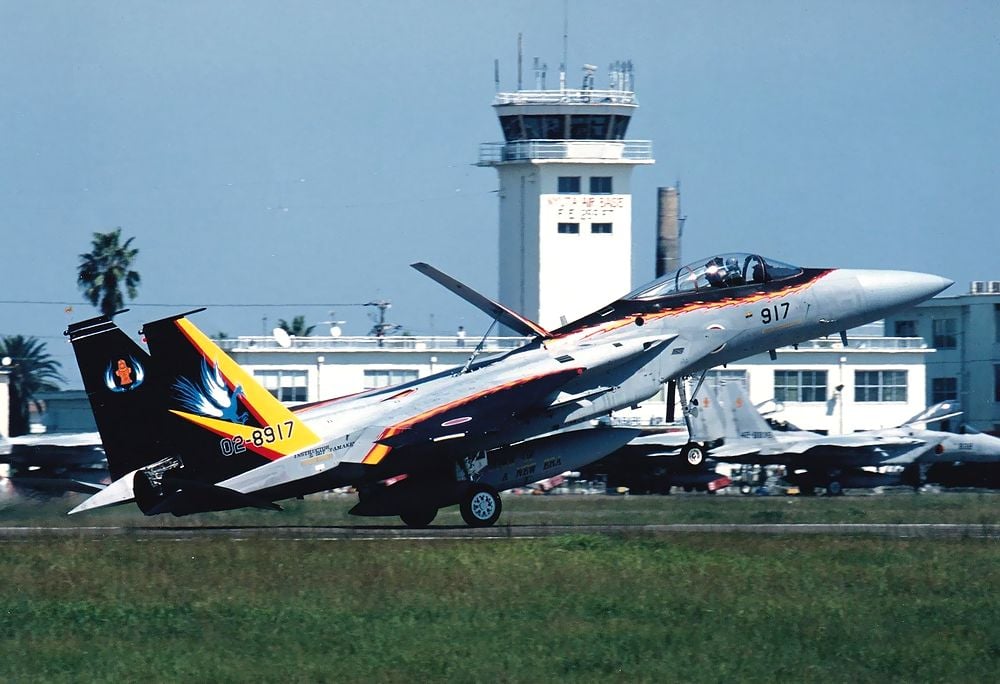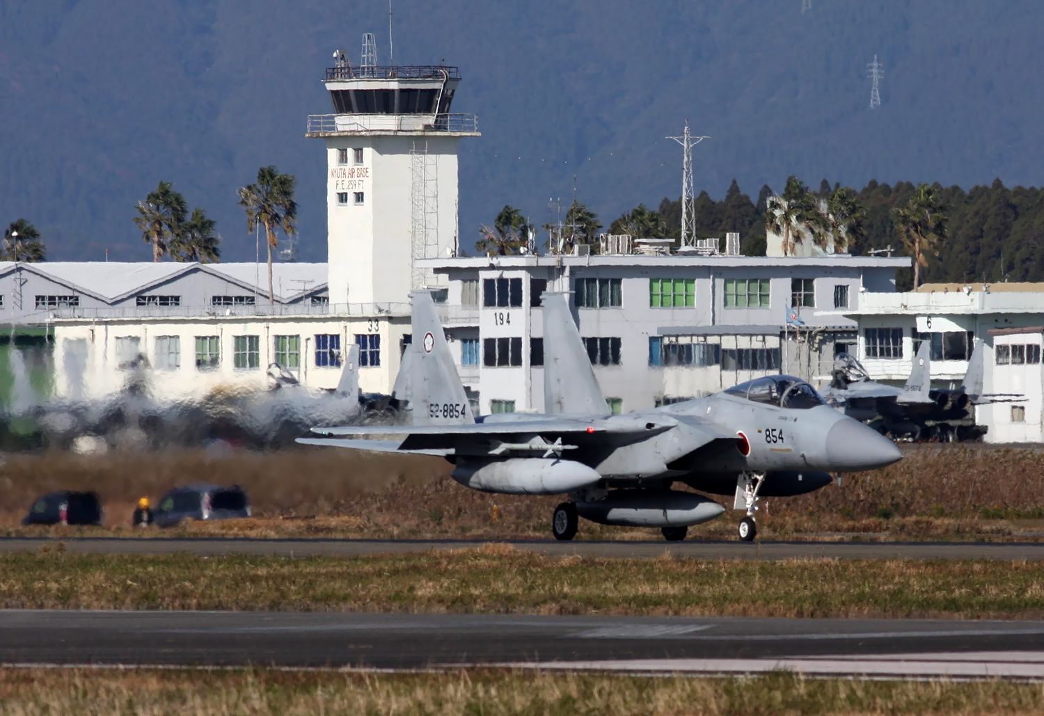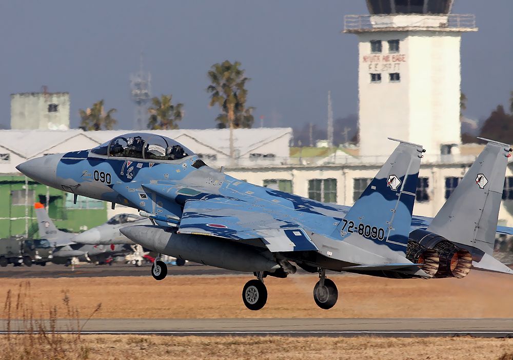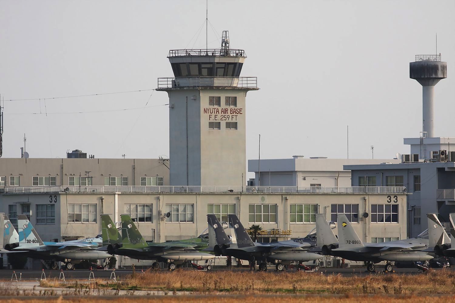 | これは2020年3月に新田原基地で撮影した、背景に「ニュータ・タワー」が写り込んだ小松基地所属の306SQ-F15Jです。 |