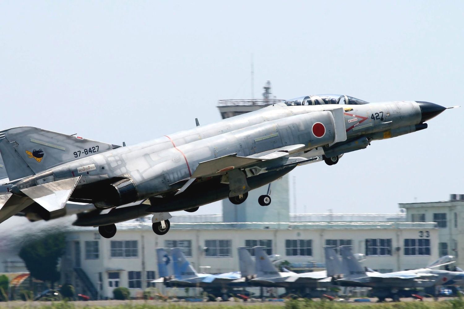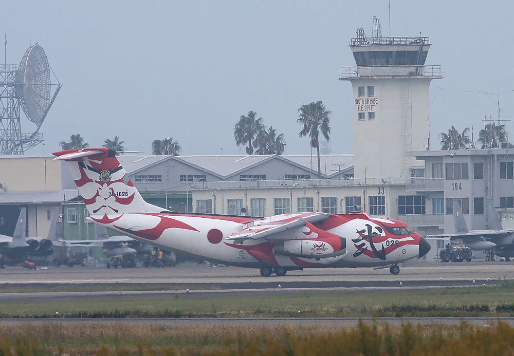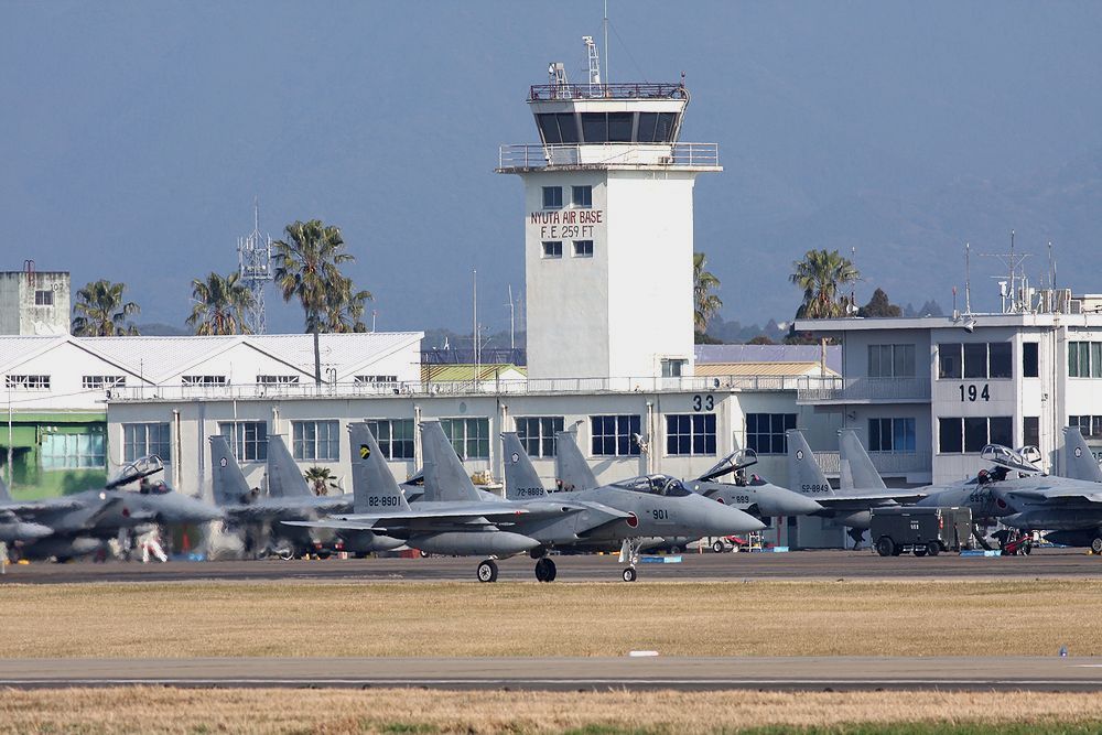 これは2015年に新田原基地で撮影した、背景に「ニュータ・タワー」が写り込んだ航空自衛隊機の写真です。