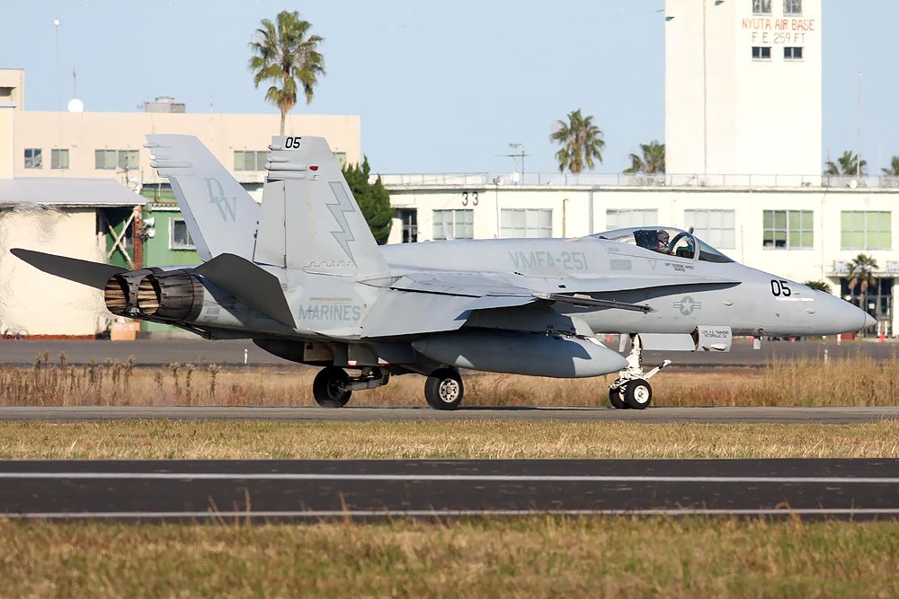 | これは2022年11月10日に新田原基地で開催された日米共同訓練で撮影した、背景に「ニュータ・タワー」が写り込んだ岩国基地の米海隊 VMFA312のFA18C/Dの写真です。 |
