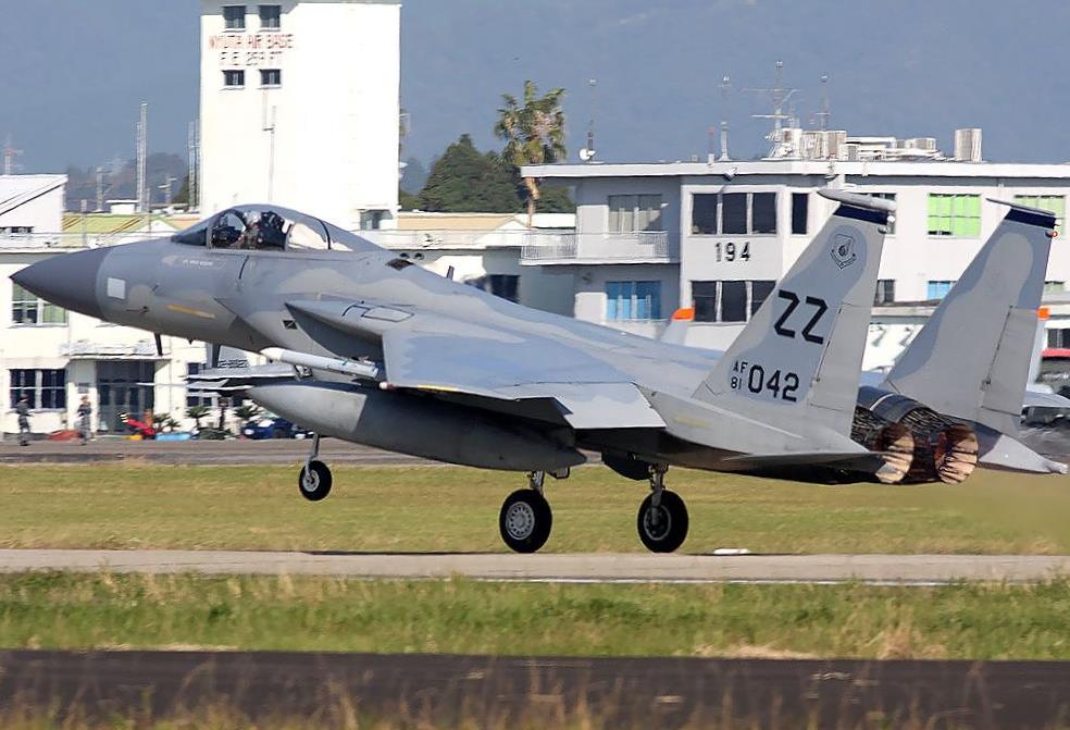 これは2018年10月に新田原基地で開催された日米共同訓練で撮影した、背景に「ニュータ・タワー」が写り込んだ嘉手納基地米空軍44FSのF15Cの写真です。