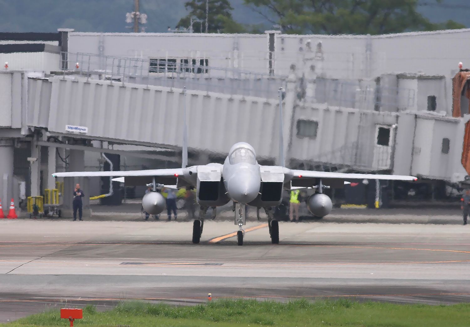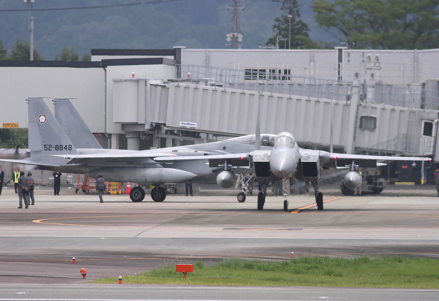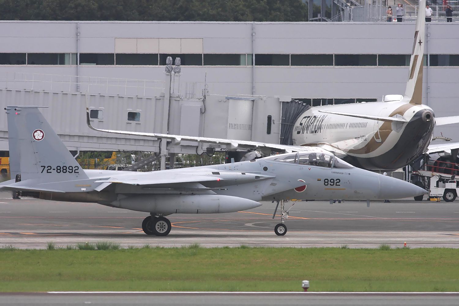 熊本空港ターミナル東端前に駐機している305SQ-F15J/DJの近くを、