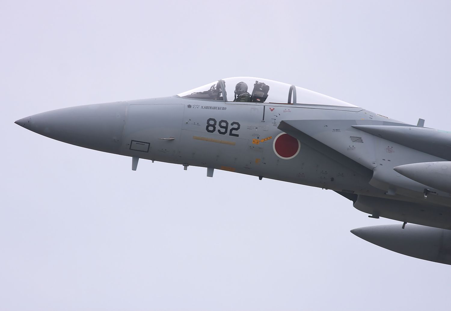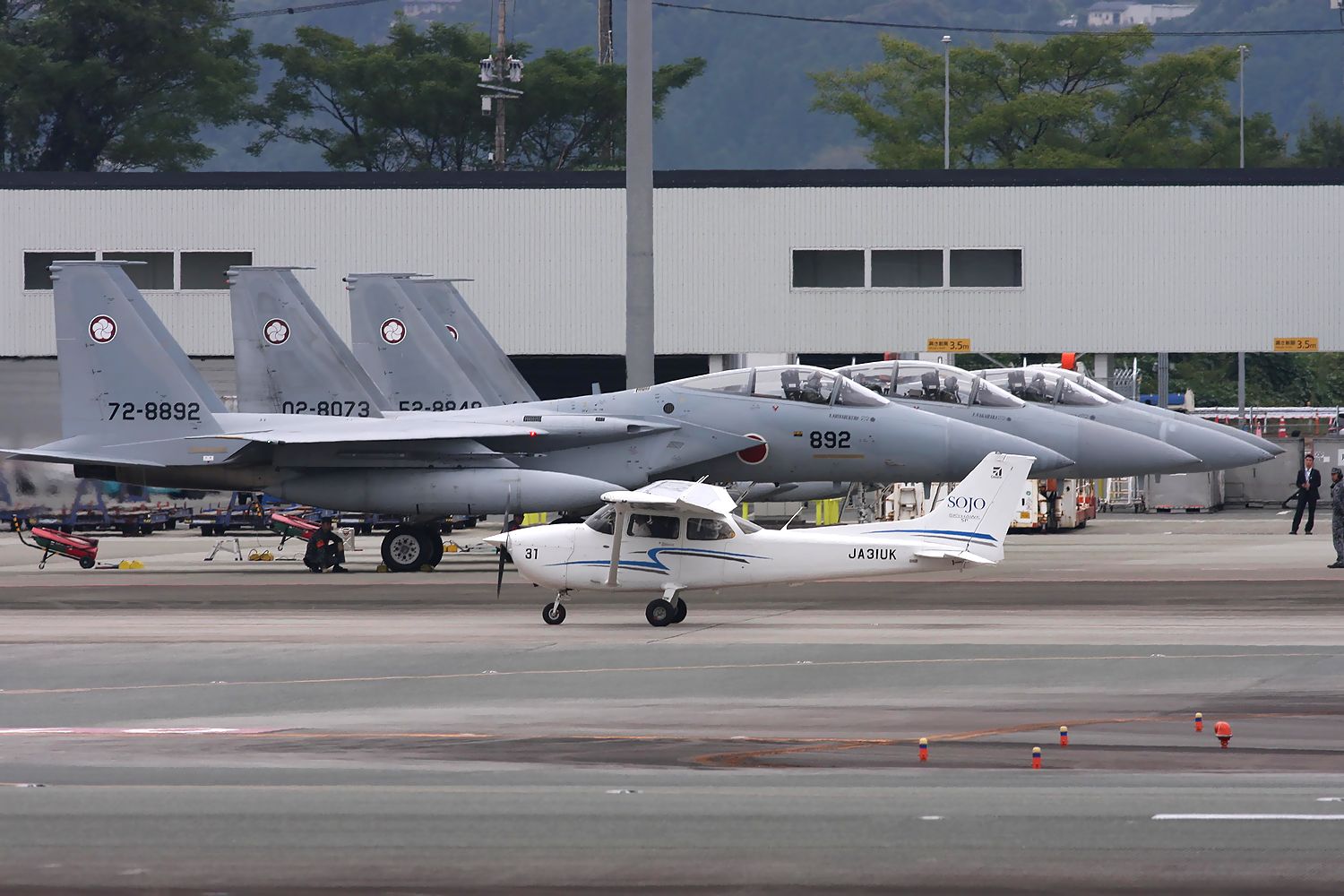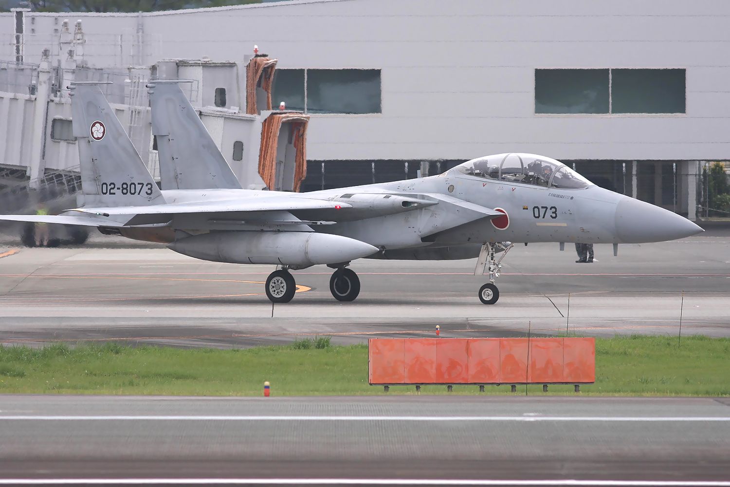 熊本空港ターミナル東端前に駐機している305SQ-F15J/DJの近くを、