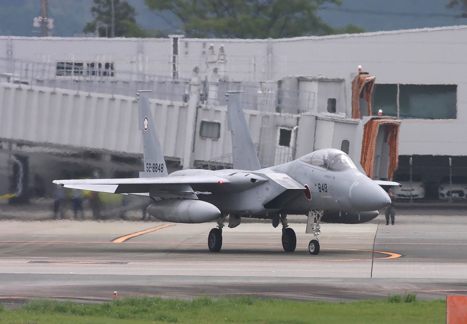 | 熊本空港ターミナル東端前に駐機している305SQ-F15J/DJがRW07エンドに向かってタキシーを始めました。 |