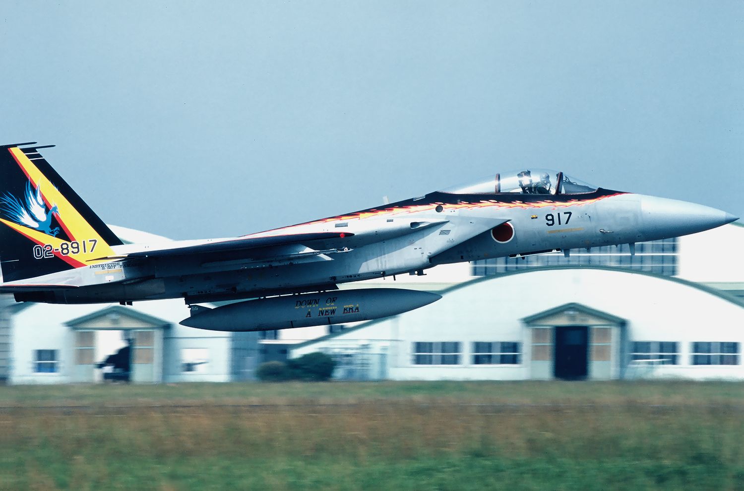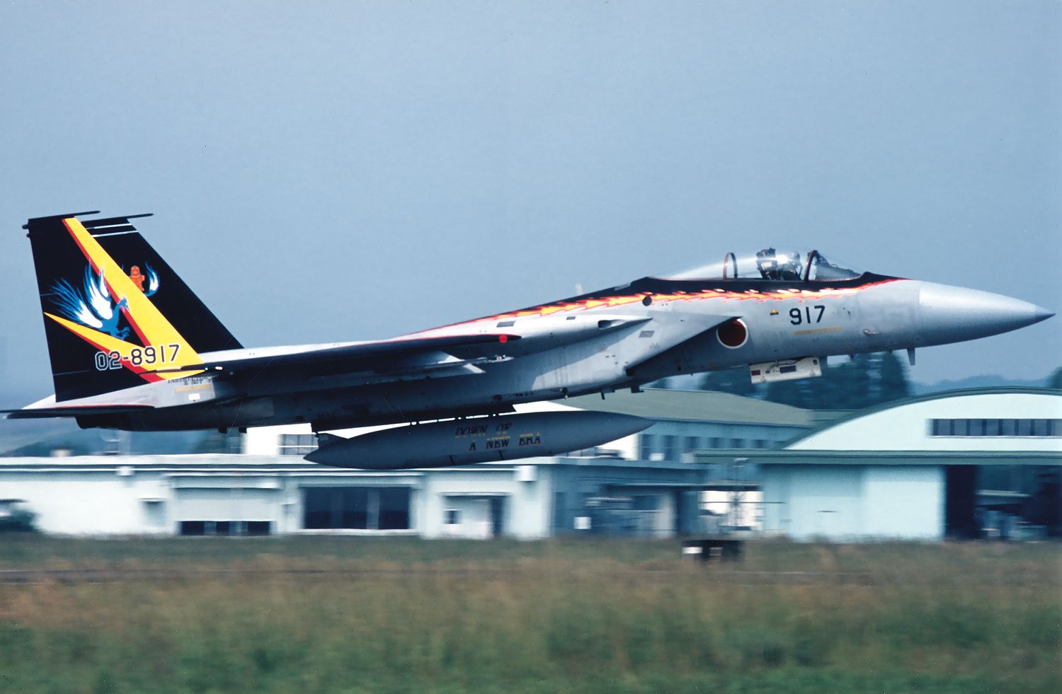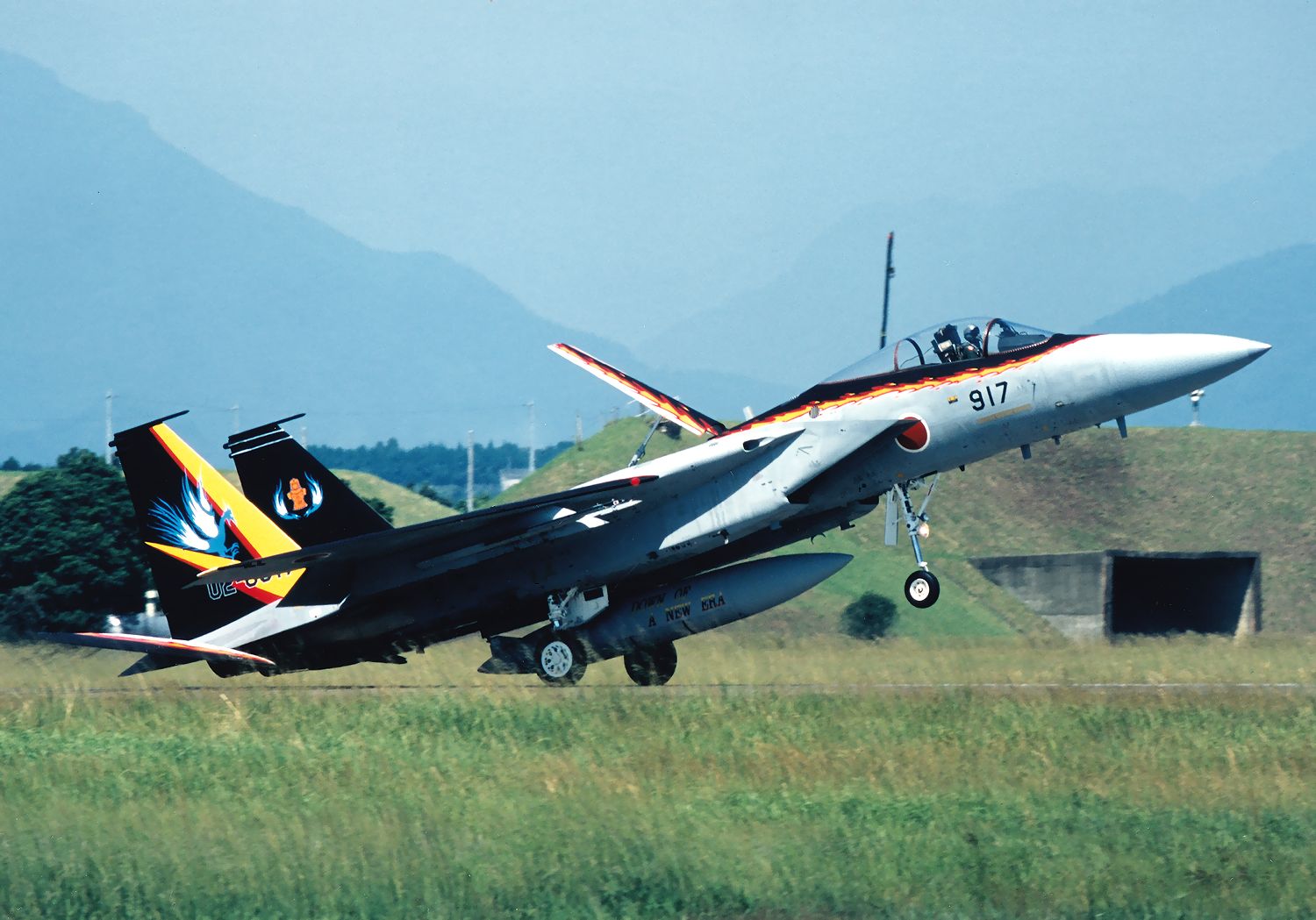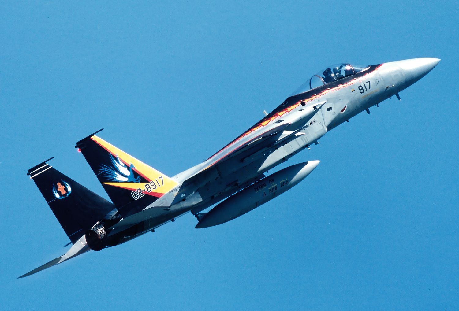 これは、2000.09.04に新田原基地で撮影した、記念塗装完成後にハイレイトクライムする 202SQのF15J 917号機です。