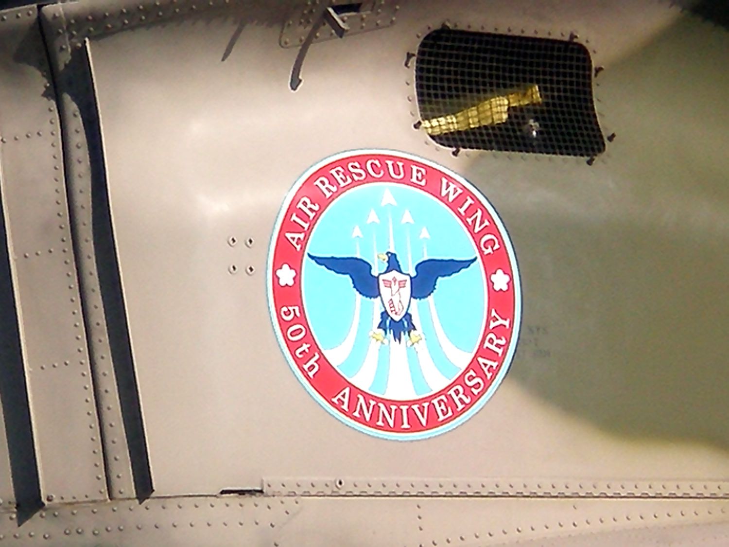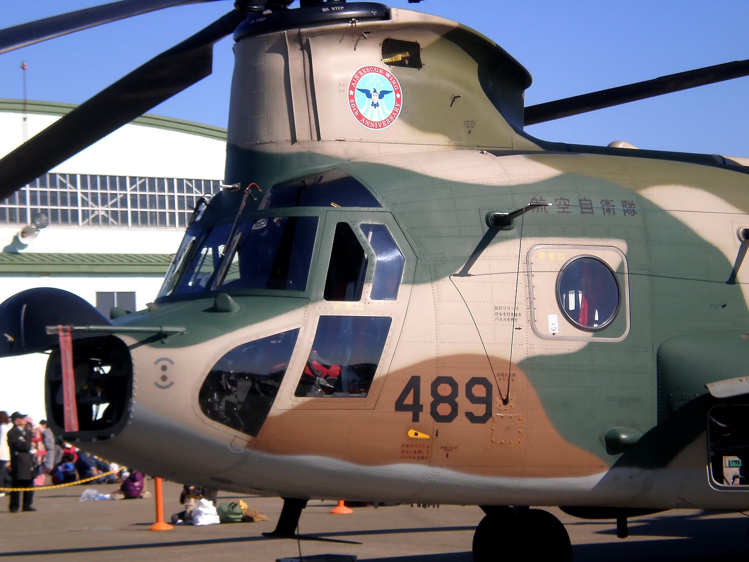 航空自衛隊 航空救難団 春日基地 春日ヘリコプター空輸隊のCH47Jです。機体には、航空救難団創立50周年記念のステッカーが貼られています。