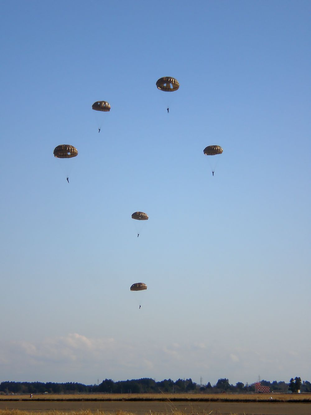 陸上自衛隊 習志野第1空挺団隊員さんによるC1輸送機からのパラシュート降下デモです。 |