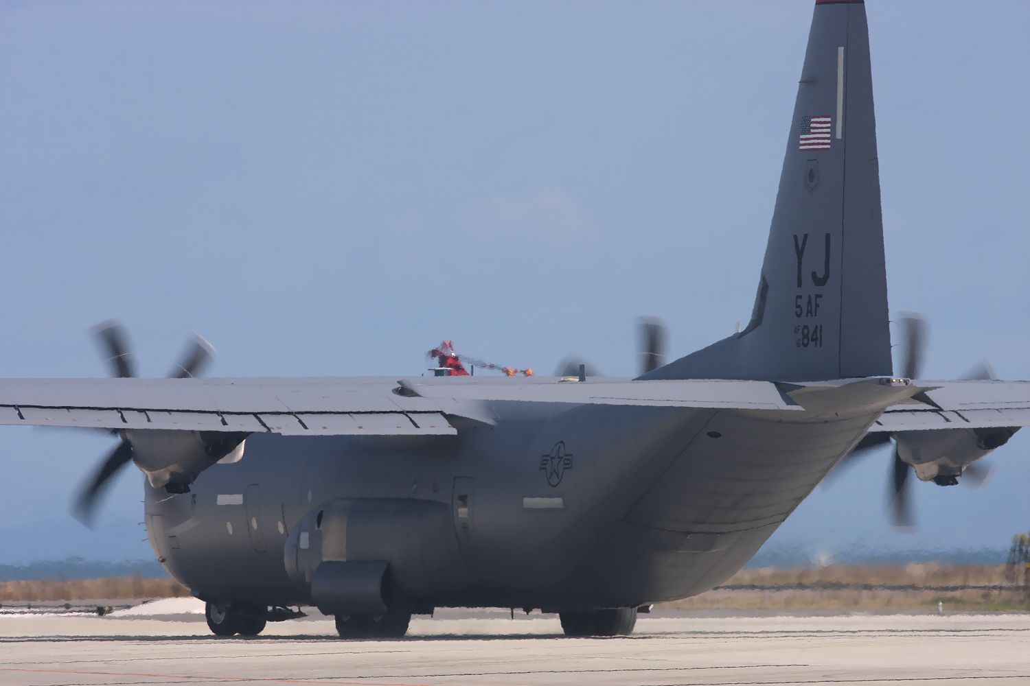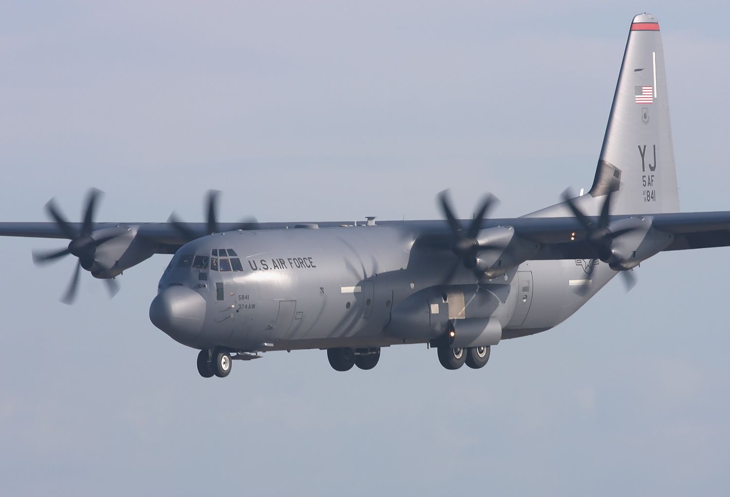 2024年10月30日に築城基地で撮影した、横田基地所属 第5空軍 第374空輸航空団 C130J(16-5841)です。